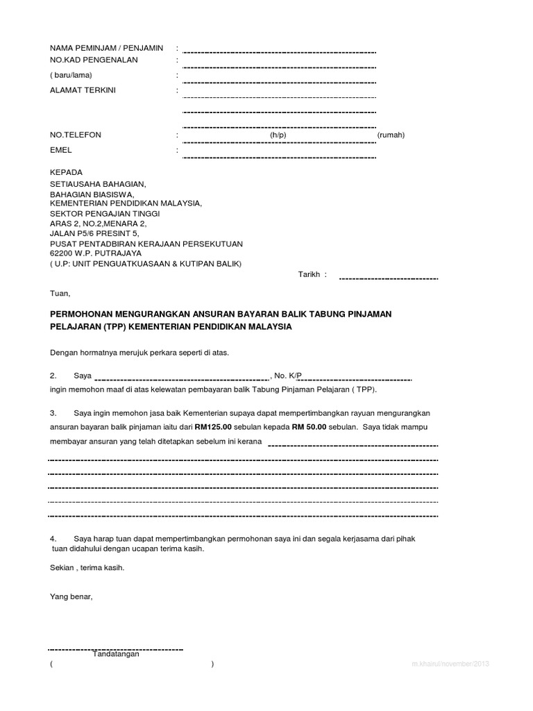 Pembayaran Balik Pinjaman Pelajaran Kementerian Pelajaran. Contoh Surat Rayuan Menangguhkan Bayaran PTPTN Jika anda mengalami masalah untuk menyelesaikan bayaran PTPTN anda seperti yang ditetapkan dalam surat tawaran pinjaman anda boleh menulis surat rayuan untuk menangguhkan bayaran tersebut. Contoh surat perjanjian hutang piutang pemberian pinjaman.